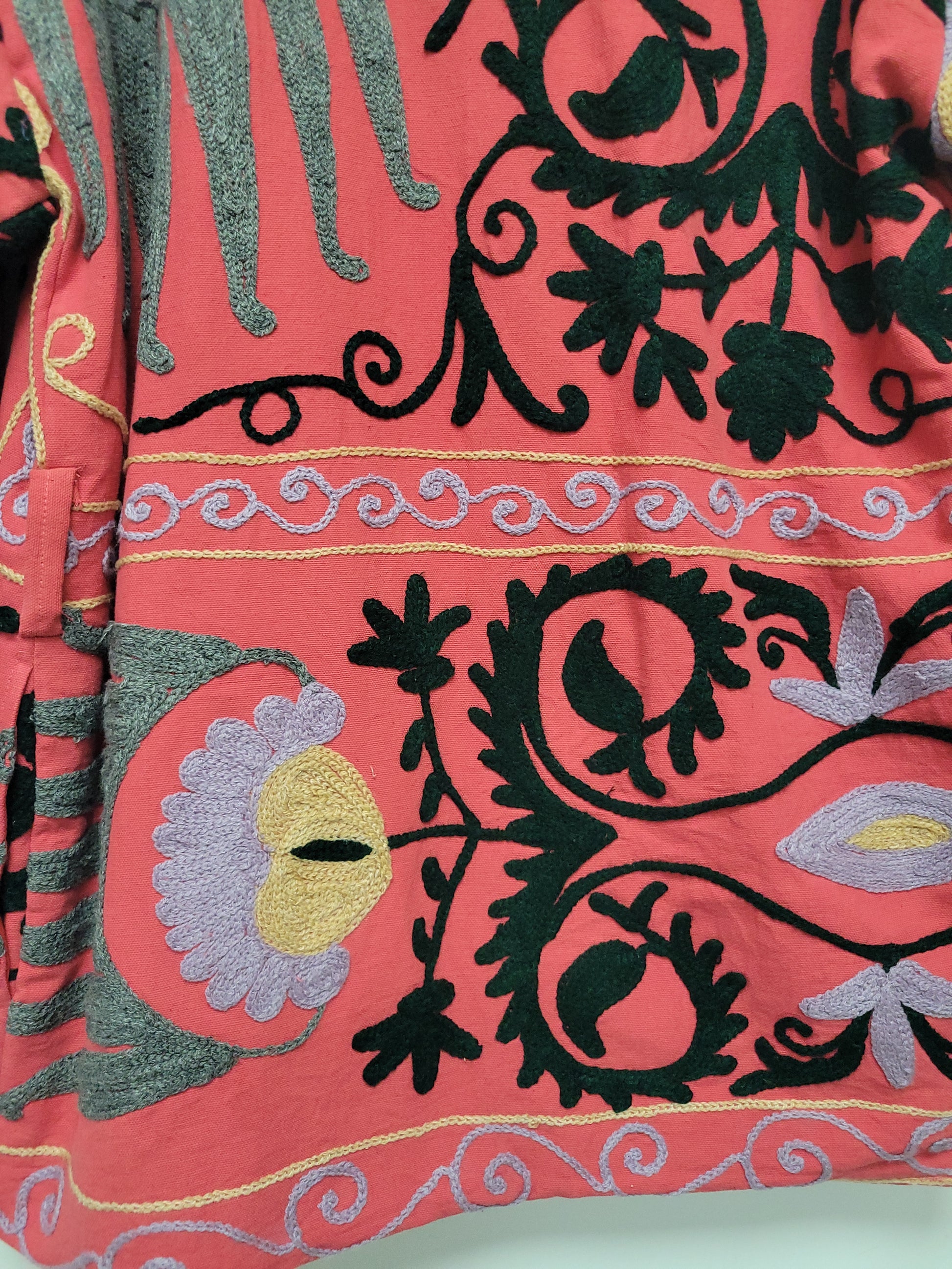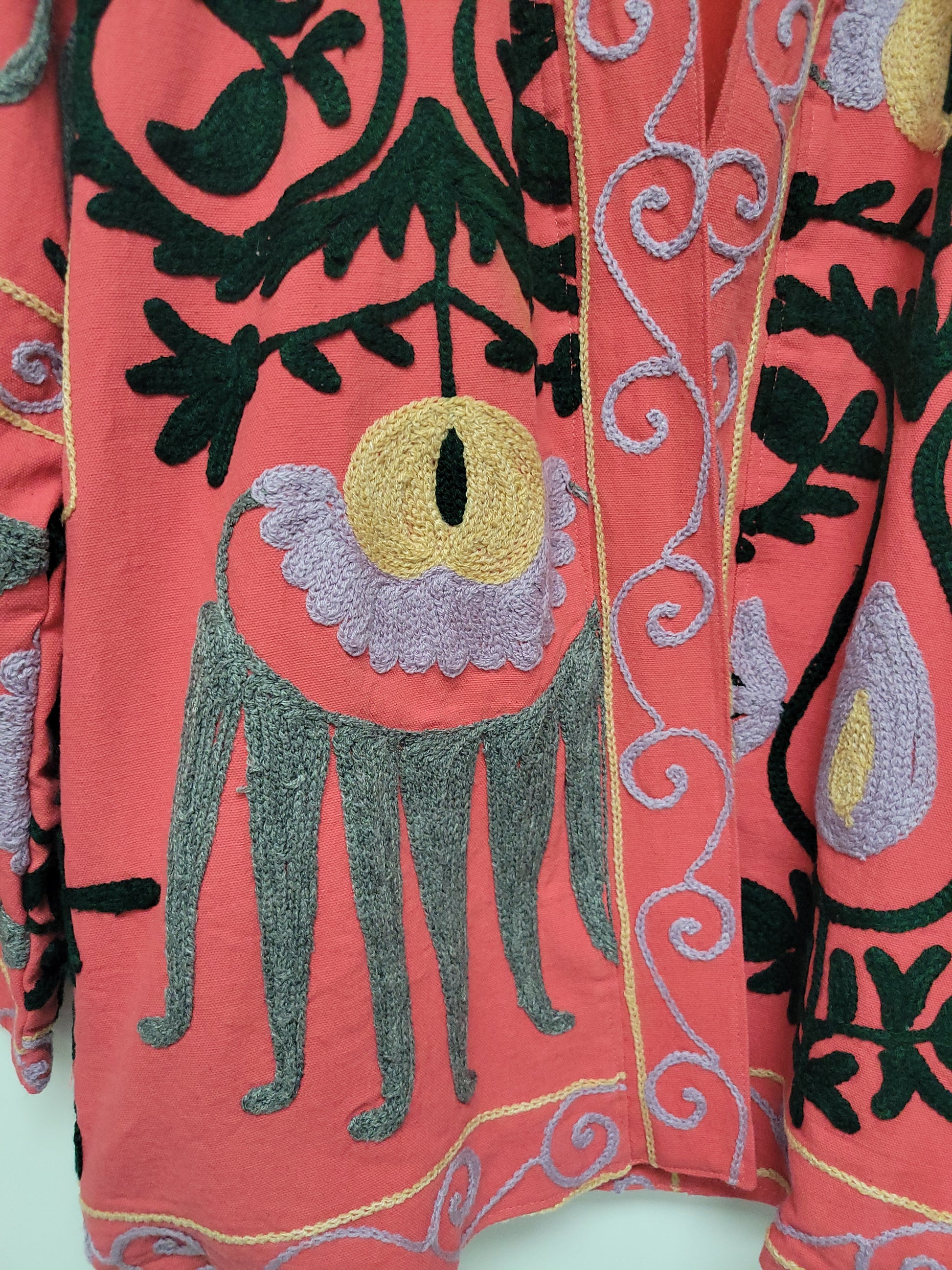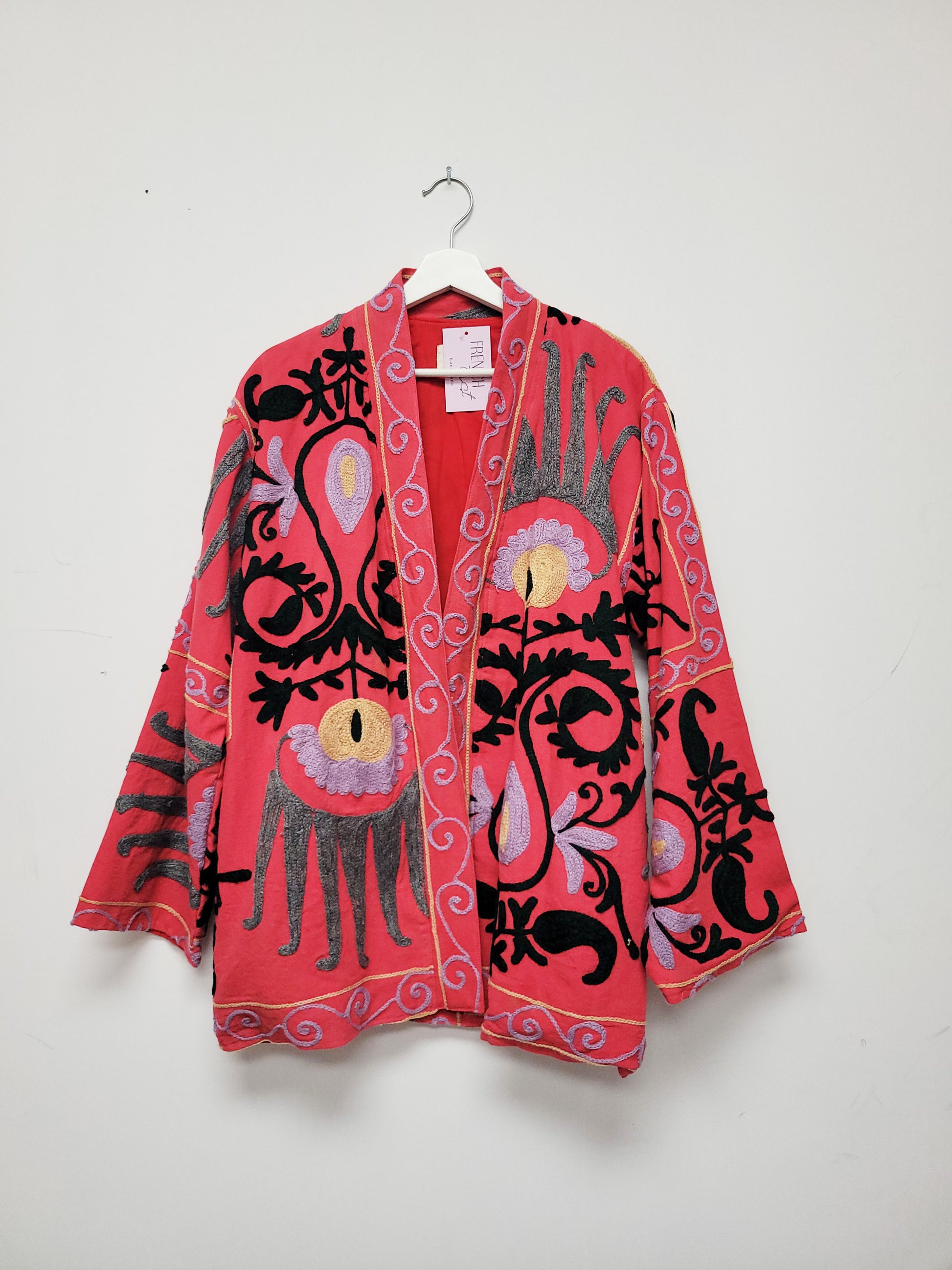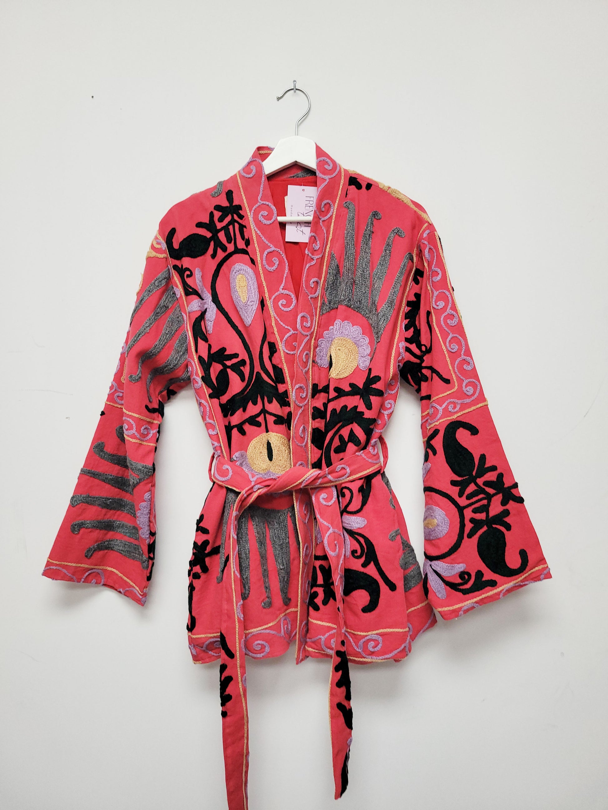 This stunning handmade suzani jacket is as unique as you are. Each piece is one of a kind, handmade andΒ hand embroidered from a traditional Indian textile called a suzani. I work directly with a small familyΒ owned business in Jaipur, India and design these amazing suzani jackets. High quality, cozy and one of aΒ kind.Β