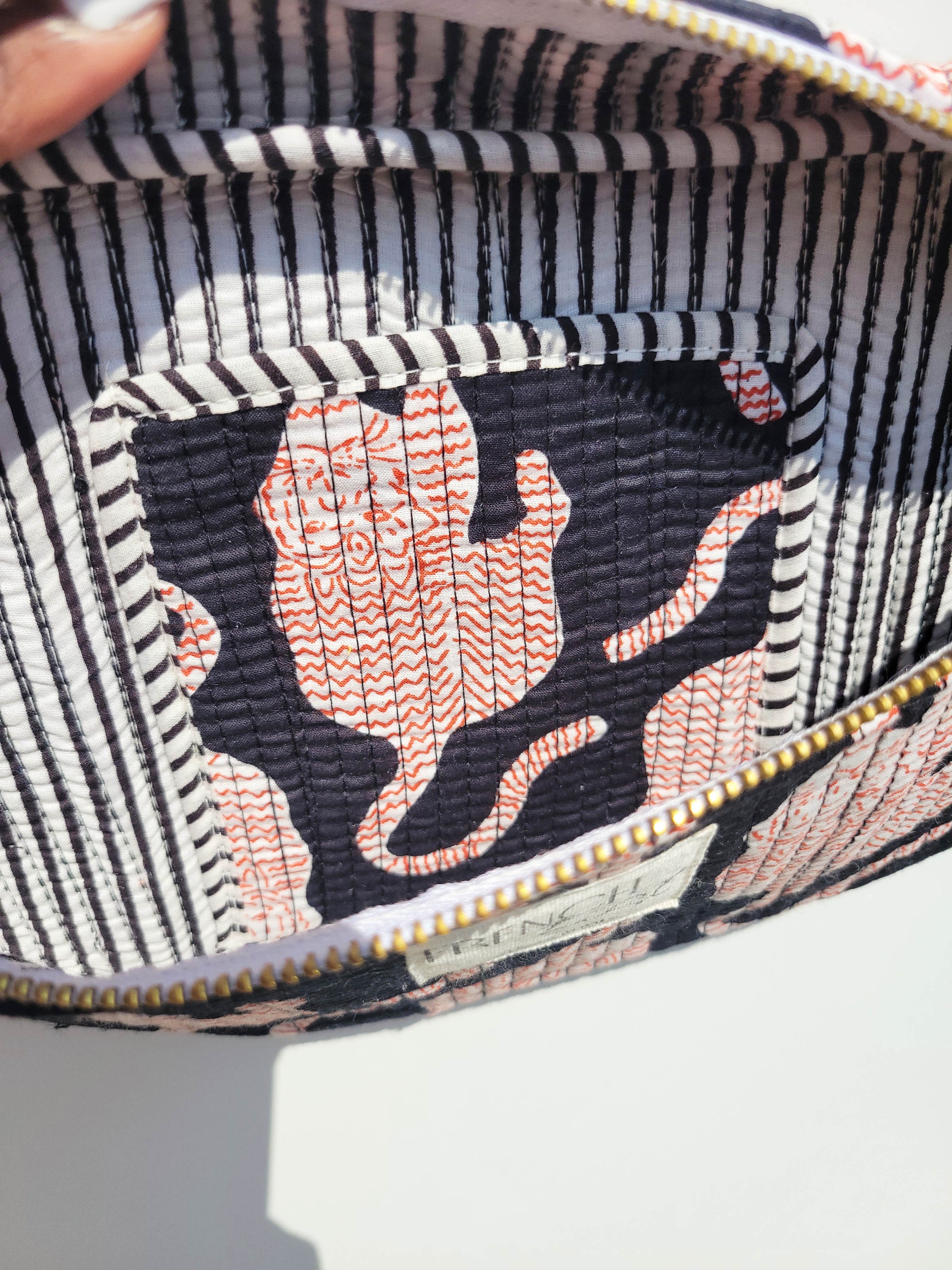 How itβs Made: Each bag is an artisanal labour of love! The fabric is block printed by hand on cottonΒ then time is spent hand filling and quilting the fabric before hand-making the bag itself. I work directlyΒ with artisans in Jaipur, India to bring these bags to life.